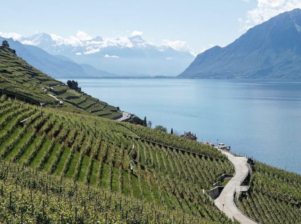Pela manhã partimos de Lausanne em direção aos vinhedos de Lavaux, patrimônio da UNESCO. Lá de cima, entre os vinhedos, temos a vista mais linda do Lac Leman.