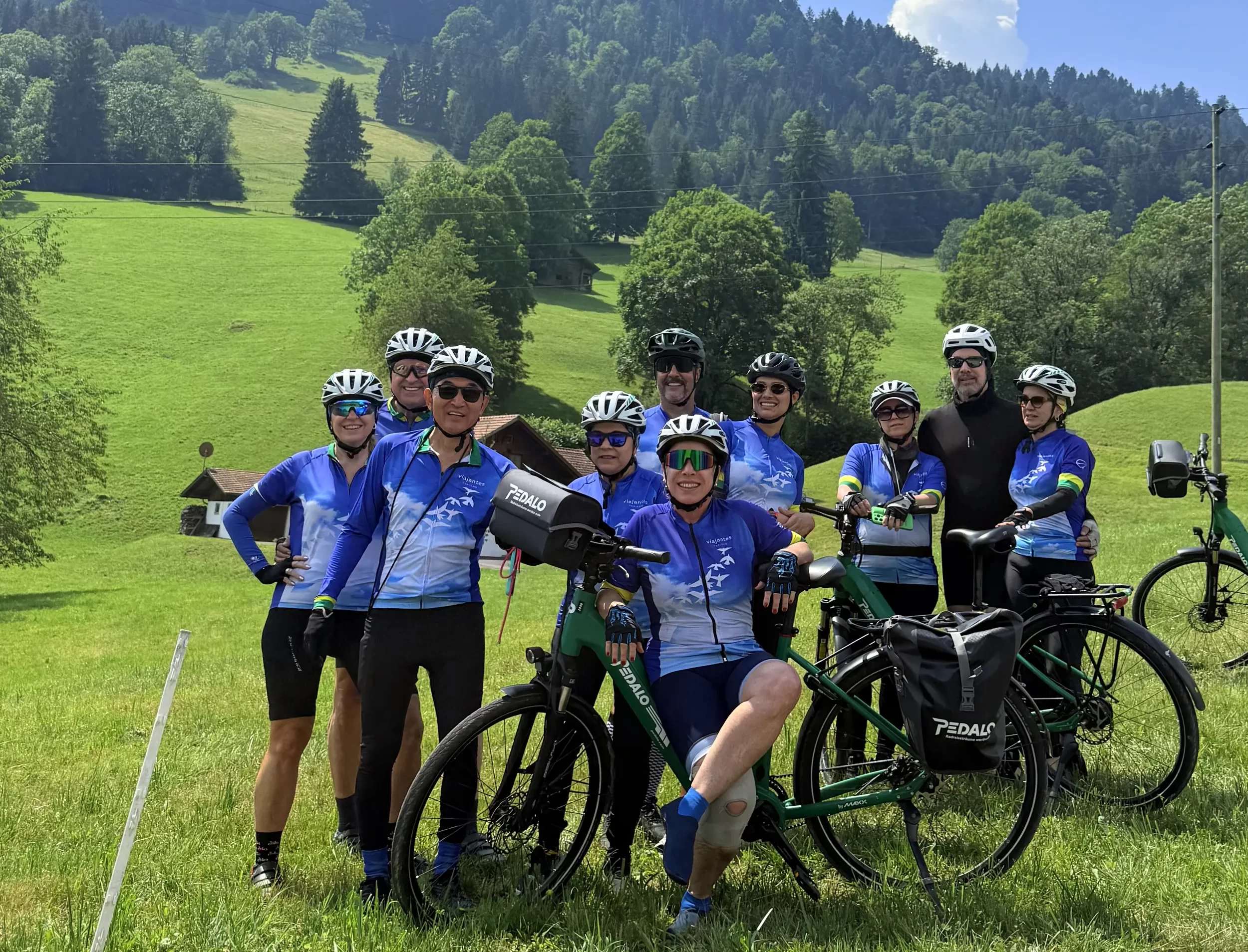 Em seguida, continuamos pedalando por um verdadeiro cartão postal da Suíça: queijarias, chalés, montanhas nevadas, teleféricos e todo um chame desse ambiente de montanhas suíças.